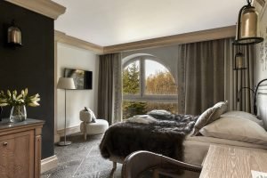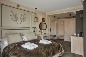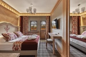 Elegancki i harmonijnie zaaranżowany pokój dwuosobowy o powierzchni 25 m², zaprojektowany z myślą o komforcie Gości ceniących spokój, estetykę i najwyższą jakość wypoczynku. Centralnym punktem wnętrza jest duże łóżko podwójne, gwarantujące wyjątkową wygodę i regenerujący sen.